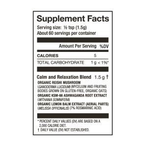 Pure calm. pure nature. This calming blend of organic Reishi. Lemon Balm. and Ashwagandha helps you manage stress and support a balanced mood.