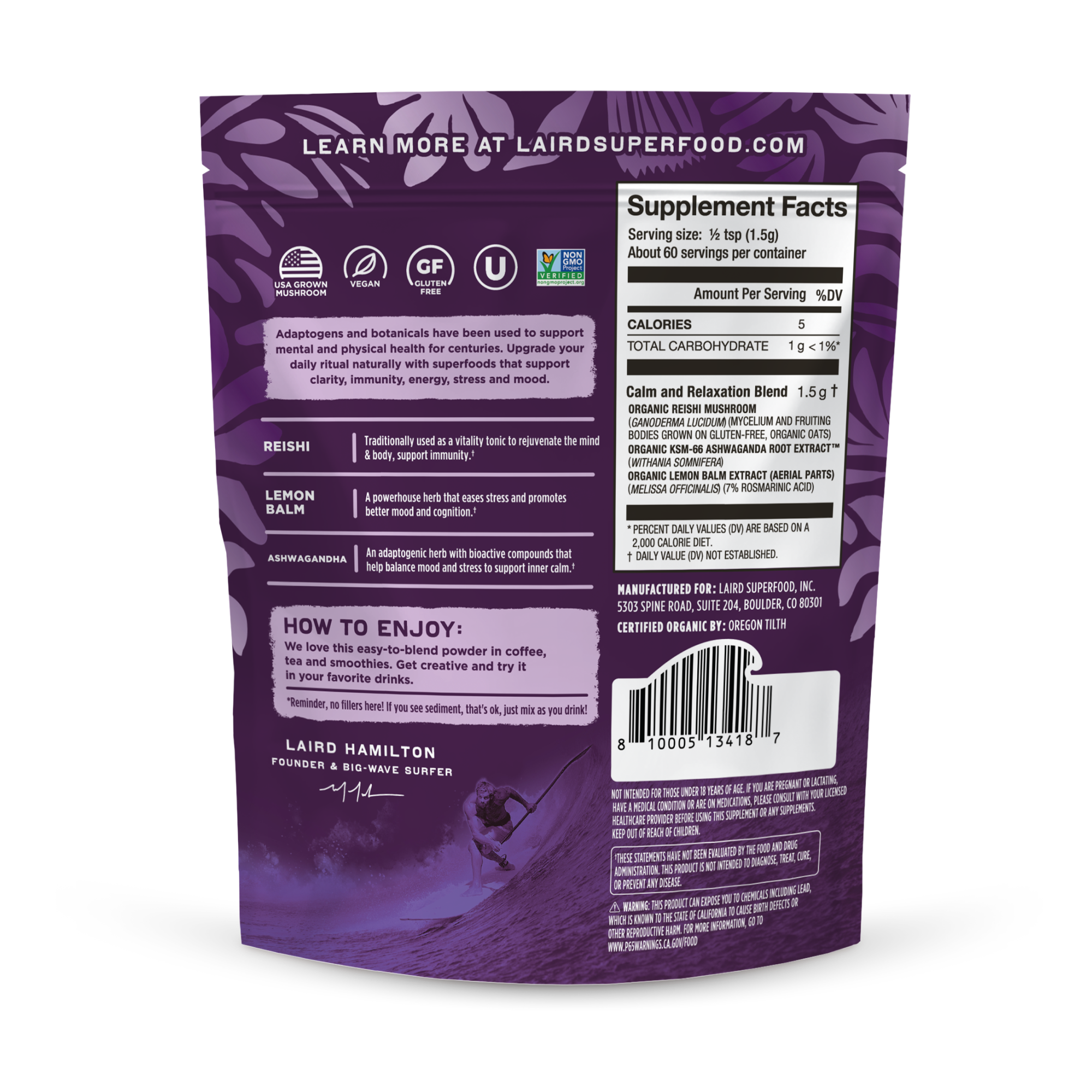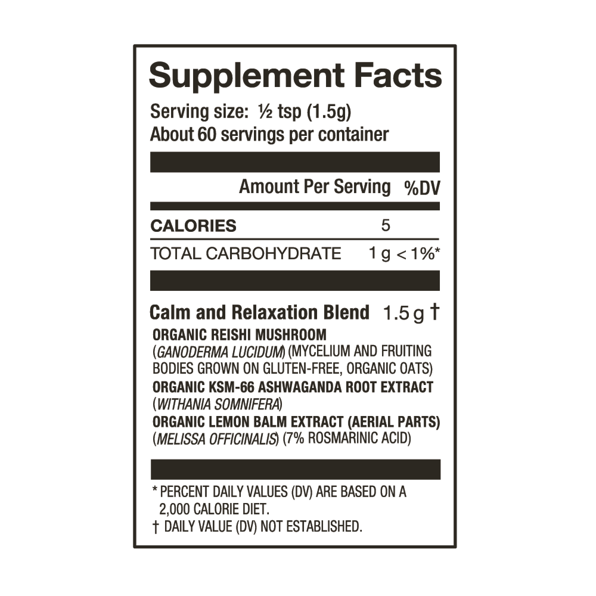 Pure calm. pure nature. This calming blend of organic Reishi. Lemon Balm. and Ashwagandha helps you manage stress and support a balanced mood.